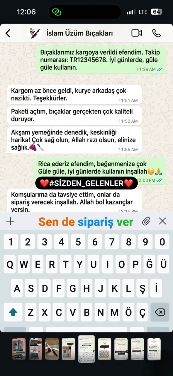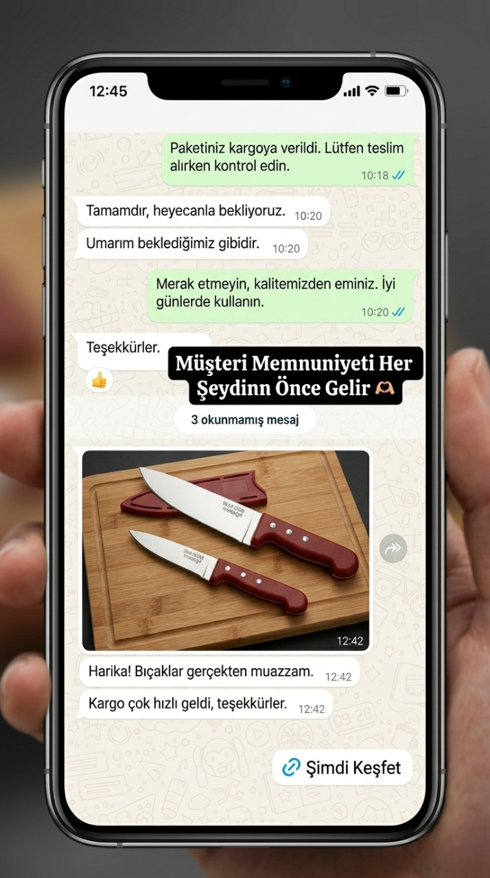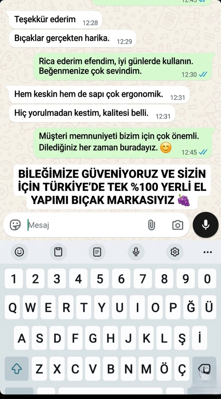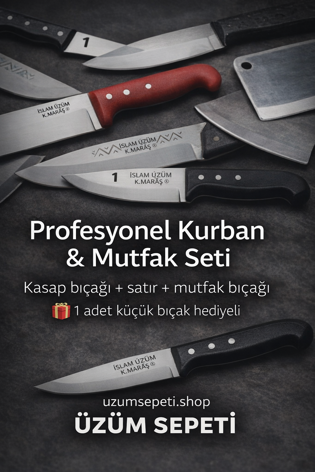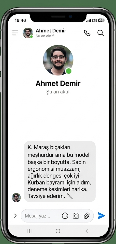 "Sıradan bıçaklar eti parçalar, Üzüm bıçakları ise adeta akıp gider. Özel ısıl işlem görmüş Maraş çeliğimiz, fabrikadan jilet keskinliğinde çıkar. Kurban sabahı bileme derdiyle uğraşmaz, zaman kazanırsınız."